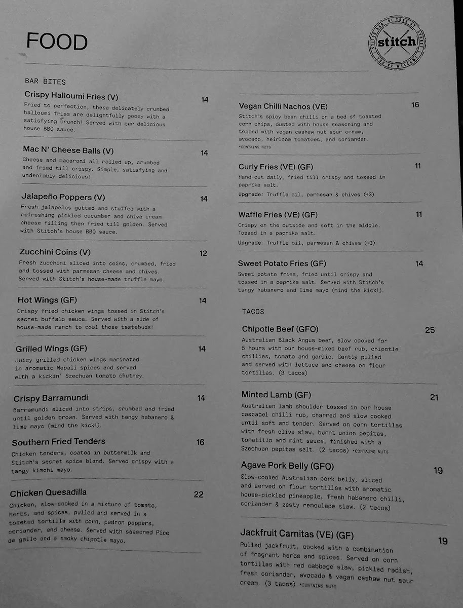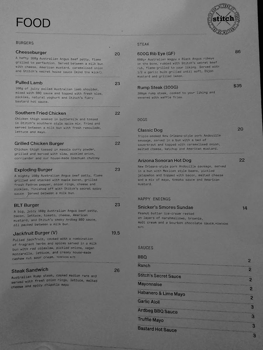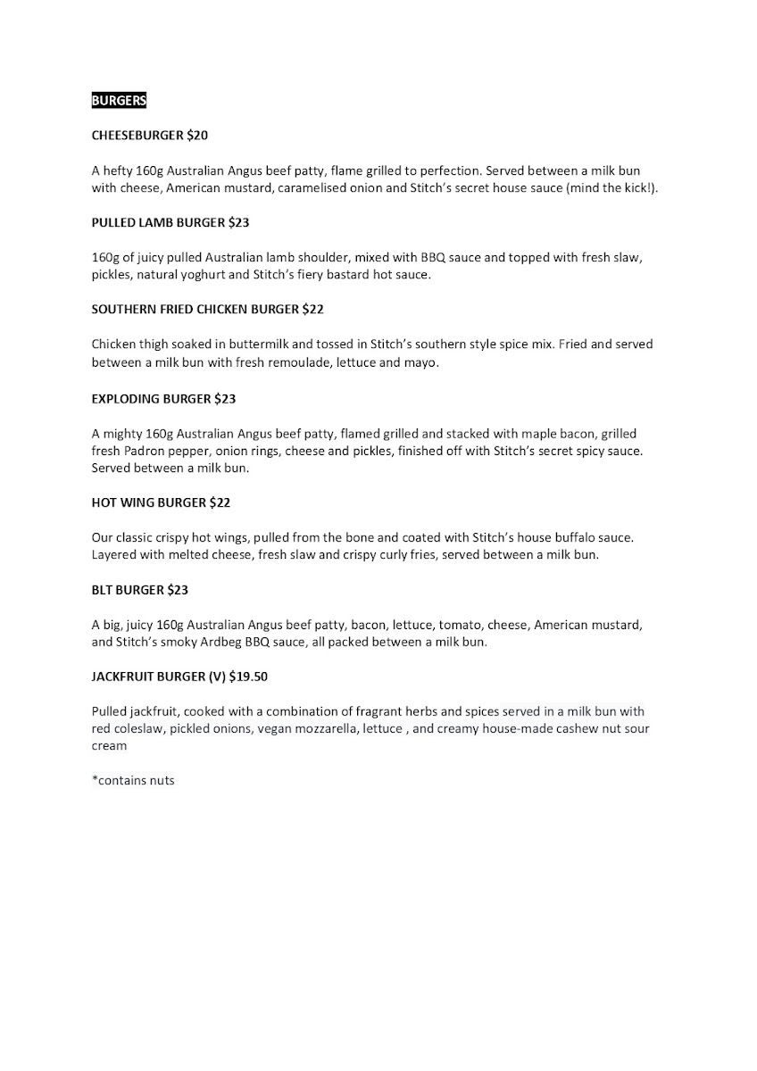 A hefty 160g Australian Angus beef patty, flame grilled to perfection. Served between a milk bun with cheese, American mustard, caramelised onion and Stitch’s secret house sauce (mind the kick!)
