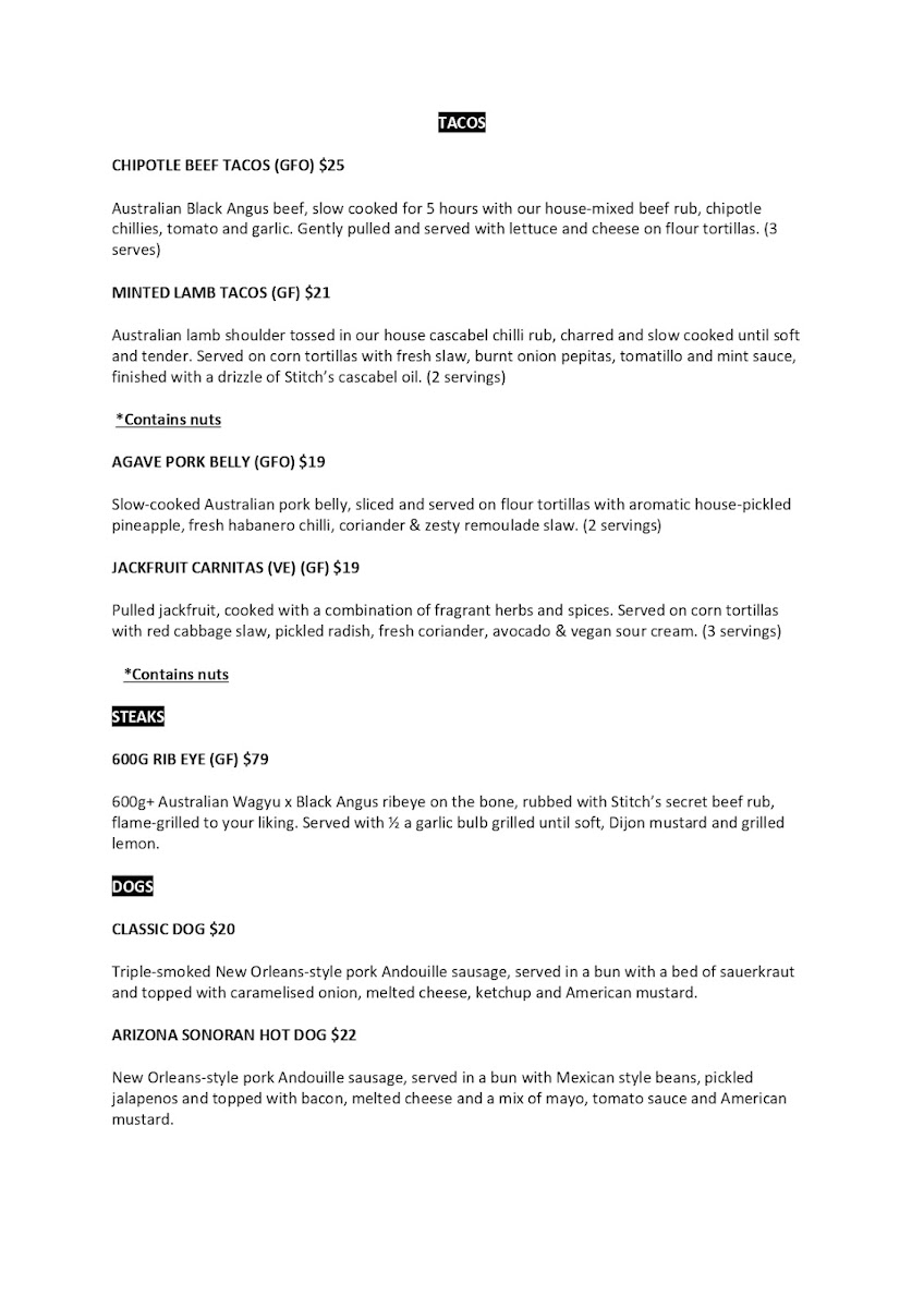 600g+ Australian Wagyu x Black Angus ribeye on the bone, rubbed with Stitch’s secret beef rub, flame-grilled to your liking. Served with ½ a garlic bulb grilled until soft, Dijon mustard and grilled lemon.